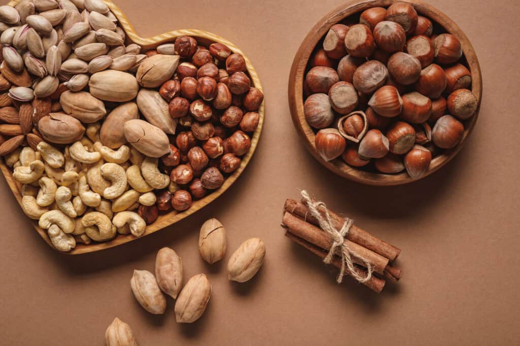 As nozes não fornecem apenas energia, carboidratos complexos com baixo índice glicêmico, fibras e ácidos graxos essenciais, mas também altas quantidades de proteína. Pistaches , amêndoas e amendoins estão entre os alimentos ricos em proteínas, apenas 50 g de pistaches contêm mais proteína do que um ovo típico. O cálcio pode ser obtido de alimentos de origem vegetal, como amêndoas, pistaches, avelãs e castanhas-do-pará.